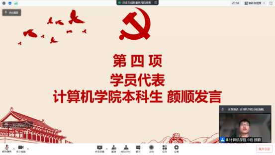此后,由计算机学院本科生颜顺作为学员代表发言。他代表全体学员向党组织承诺,将会珍惜此次学习机会,主动按照党员的标准严格要求自己,以饱满的热情、高度的责任感投入到入党积极分子培训班的学习中,并以良好的精神面貌、端正的学习态度来接受党组织的考验。