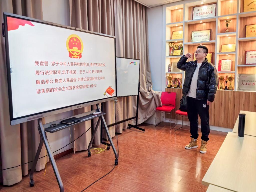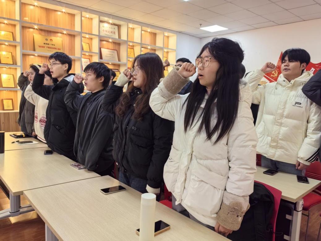 宪法宣誓环节,由肖克领誓,团学干部们全体起立,右手握拳,高举头顶,庄严宣誓。宣誓词掷地有声,体现成员们内心深处对宪法的敬畏,以及维护宪法尊严、履行法定职责的坚定决心。