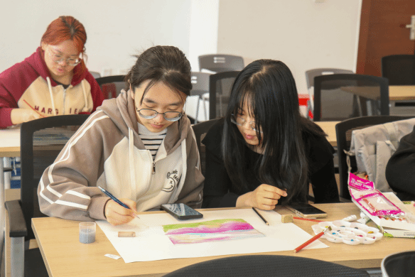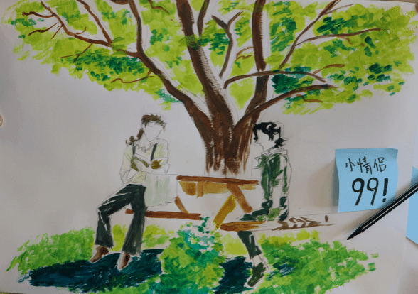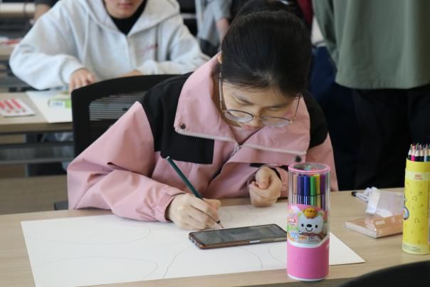 在自由创作环节,现场准备水彩、彩铅、蜡笔等多种绘画工具,供参与者进行主题创作。活动中,学生们或低头沉思,或与身旁伙伴轻声探讨绘画思路和技巧,现场洋溢着浓厚的创作氛围。在春日主题的激发下,同学们以画笔为媒,将内心世界具象化为一幅幅春日图景。