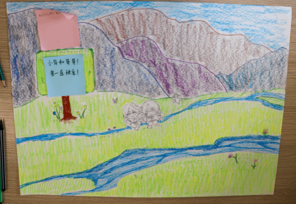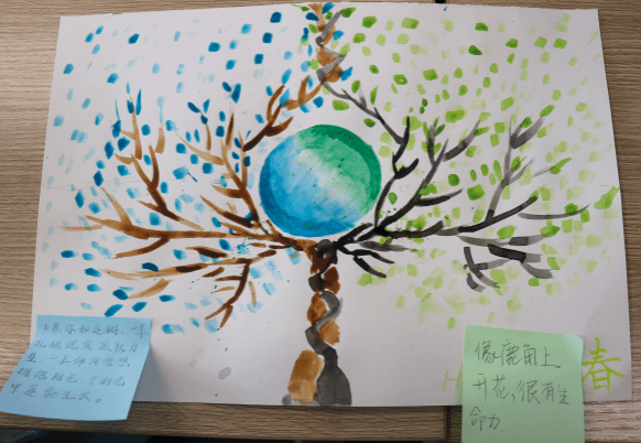参与者的作品风格各异,尽显创意。创作内容丰富有趣,包含校园春景、植物及动漫图案等。通过彩铅描绘、工笔勾勒、蜡笔涂抹和水彩上色等方式,为画面注入活力与温馨。