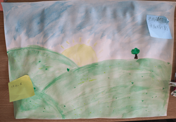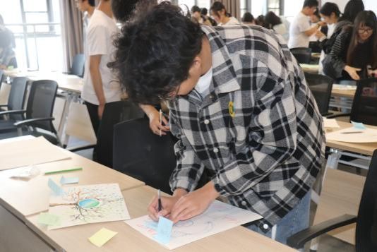 自由创作环节结束后,同学们相互欣赏作品,并通过便利贴留言寄语。一名学生在画作旁留言:“在这色彩交织的天地,每一笔都是奇思妙想的绽放。愿你带着这份无畏的创意去探索更多未知的绚烂。”这些真诚而温暖的寄语,饱含着参与者对画作的欣赏、对他人的鼓励和对未来的期许,传递着温暖人心的力量。
