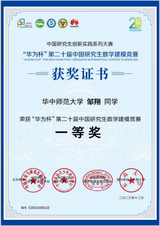 “华为杯”第20届中国研究生数学建模竞赛决赛及颁奖典礼于2023年12月16日至17日在东南大学举行,我院2023级研究生邹翔所在队伍在激烈的竞争中脱颖而出,荣获国家一等奖。