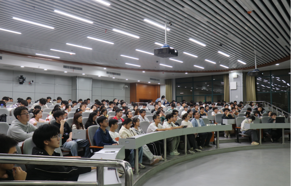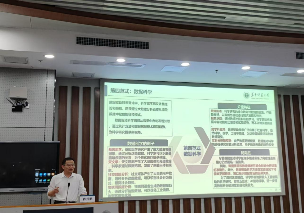在谈到科研历史进程时,蒋兴鹏为同学们详细介绍了科学研究的五大范式,分别是以观察实验为特征的实验科学范式,以数学建模、逻辑推导为特征的理论科学范式,以高效数据处理、数值模拟为特征的计算科学范式,以数据驱动、模式识别为特征的数据科学范式,以预测生成、自适应为特征的人工智能驱动科学范式。如今,人工智能正推动着科研第五范式到来,他强调:“人工智能在数据分析、模式识别和预测方面的能力,帮助科学家们突破了传统研究方法的局限。”