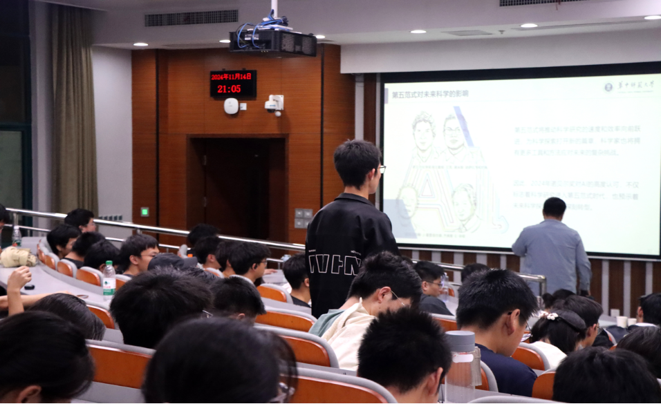 为帮助新生深入了解人工智能如何开启科研第五范式、探讨2024年诺贝尔奖对人工智能的高度关注背后的原因,蒋兴鹏从“AI与2024年诺贝尔奖”“科学研究的五大范式”“科研第五范式的到来”“第五范式对未来科学的影响”四个方面深入浅出地展开讲解,介绍了人工智能在科研领域的辅助作用及其对科研方式的影响。