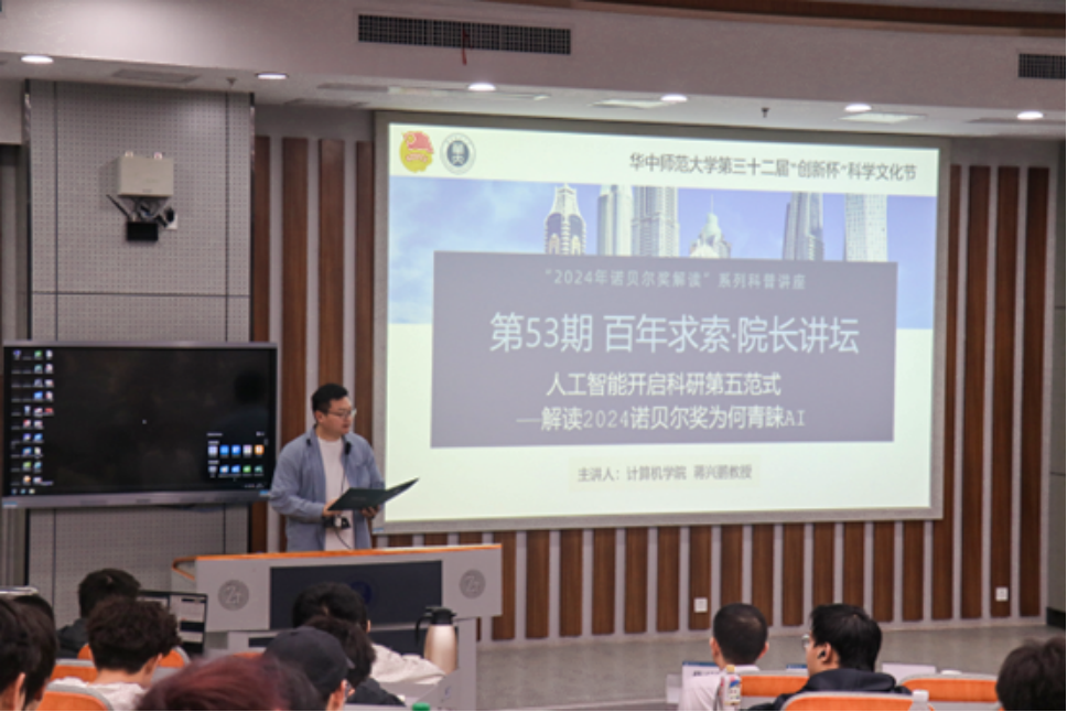 计算机学院记者团讯(通讯员 姚万鑫 王妍惠 高涵 编辑 黄丝语 胡一凡)11月14日晚,由共青团华中师范大学委员会主办,共青团华中师范大学计算机学院承办的第53期“百年求索·院长讲坛”于南湖综合楼N111教室举行。本次讲座特别邀请到华中师范大学计算机学院院长蒋兴鹏教授,带来题为《人工智能开启科研第五范式——解读2024诺贝尔奖为何青睐AI》的专题讲座,计算机学院团委书记肖克、2024级本科生辅导员赵丹、2024级本研学生参加活动。本次讲座由肖克主持。