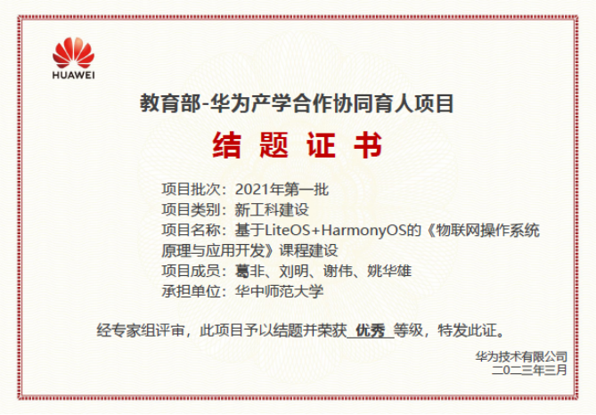 我院葛非、刘明、谢伟、姚华雄等老师承担的教育部-华为产学合作协同育人项目“基于LiteOS+HarmonyOS的《物联网操作系统原理与应用开发》课程建设”荣获优秀等级。同时,在华为优秀项目成果总结会中被授予“教育部产学合作协同育人项目华为优秀成果奖”。