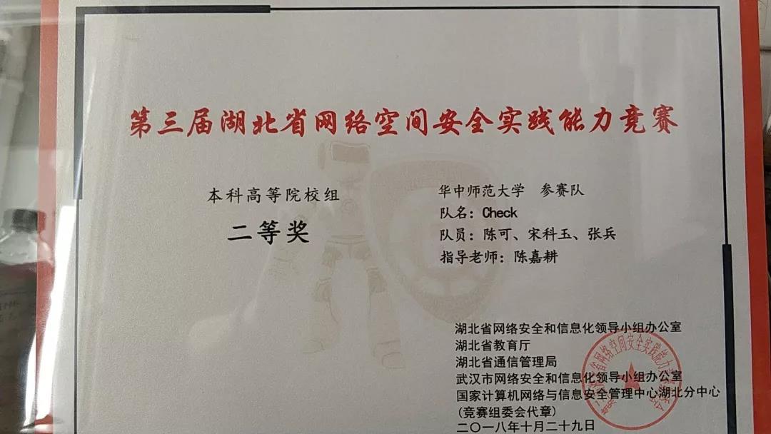 计算机学院记者团讯(通讯员 许心媚)10月29日上午,第三届湖北省网络空间安全实践能力知识竞赛决赛及闭幕颁奖仪式在华中科技大学举行。决赛采用攻防混战模式,所有参赛队伍在统一平台上进行比赛。经过激烈角逐,华中师范大学计算机学院参赛队“Check”,成员包括陈可、宋科玉、张兵,在陈嘉耕老师的指导下荣获此次大赛本科高等院校组二等奖,为校争光。