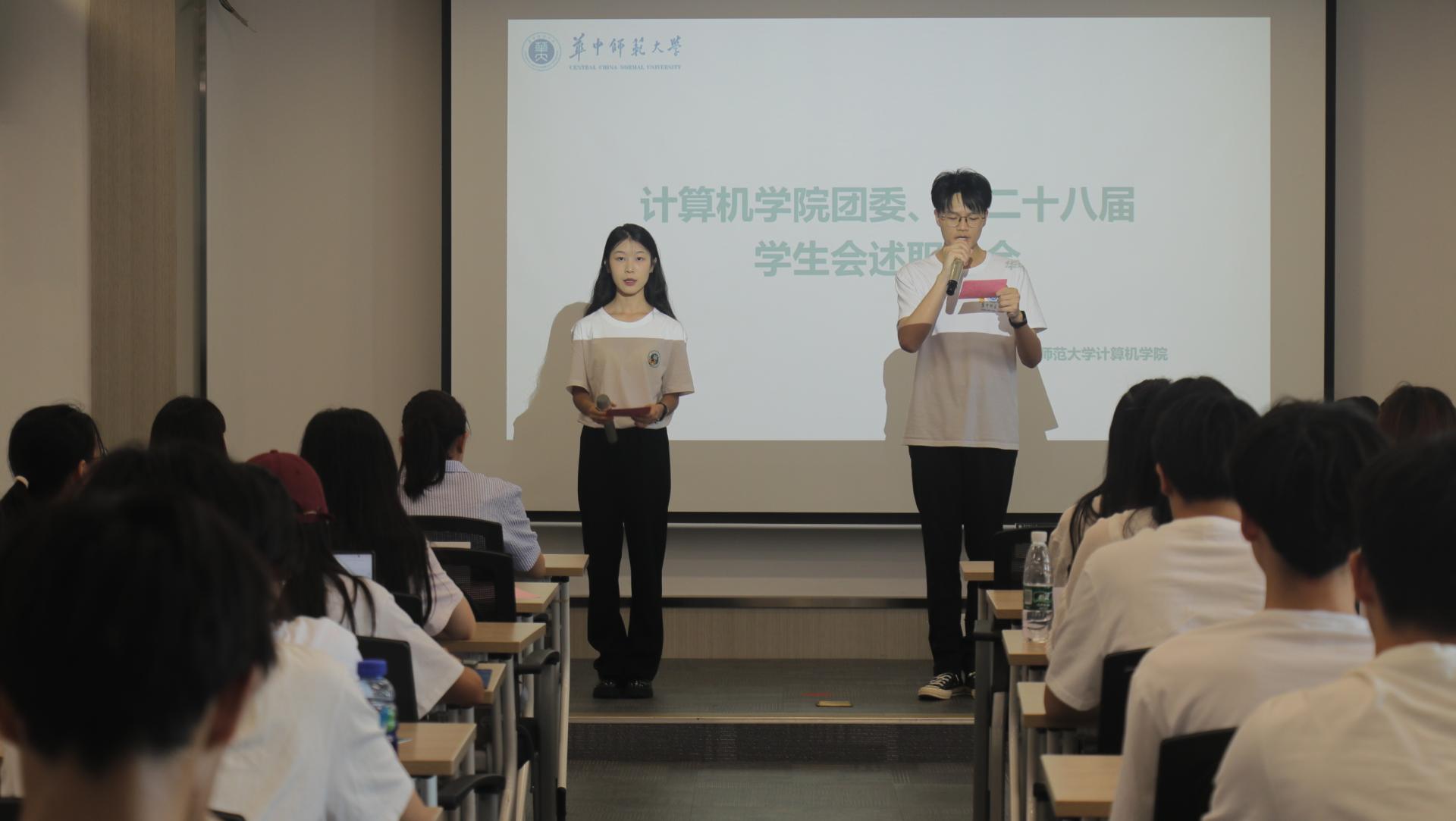 计算机学院团委副书记谢晓培以习近平总书记的话语“心中有阳光,脚下有力量”展开汇报。她提出,团学成员们应该加强思想政治教育引领、实践育人展现青年担当。学生会主席蒋序朝、学生会副主席张佳文、向星宇依次进行述职。向星宇强调:“每一次的前进不是机缘巧合,而是从可爱的团学人上获得的勇气催促着我前进。”