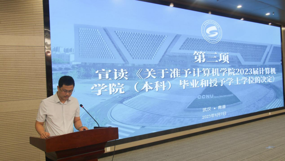 计算机学院副院长谢伟、崔建群分别宣读了《关于准予计算机学院2023届计算机学院(本科)毕业证和授予学士学位》的决定以及《关于准予计算机学院2023届计算机学院(研究生)毕业和授予硕士学位》的决定。为选树毕业生先进典型,培养优秀人才,院党委副书记庄甲鹏宣读《关于授予张小丫等60名同学华中师范大学2023届优秀毕业生称号》决定。蒋兴鹏、何婷婷为毕业生代表颁发毕业证书和学位证书,莫然、常亚楠为优秀毕业生颁发证书并赠与毕业礼包。