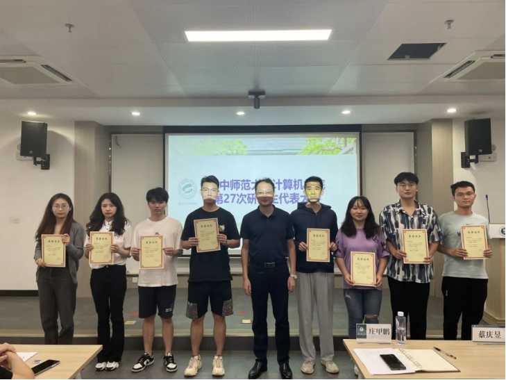 为进一步强化研究生会干部队伍建设,开启研究生会发展新篇章,10月12日下午,计算机学院第27次研究生代表大会暨研究生会换届大会于南湖综合楼7119会议室举行。学院党委副书记庄甲鹏、研究生辅导员蔡庆昱出席本次会议,计算机第26届研究生会成员、2023级全体硕士研究生参加了本次会议。大会由第26届研究生会文体部副部长董彤瑶主持。