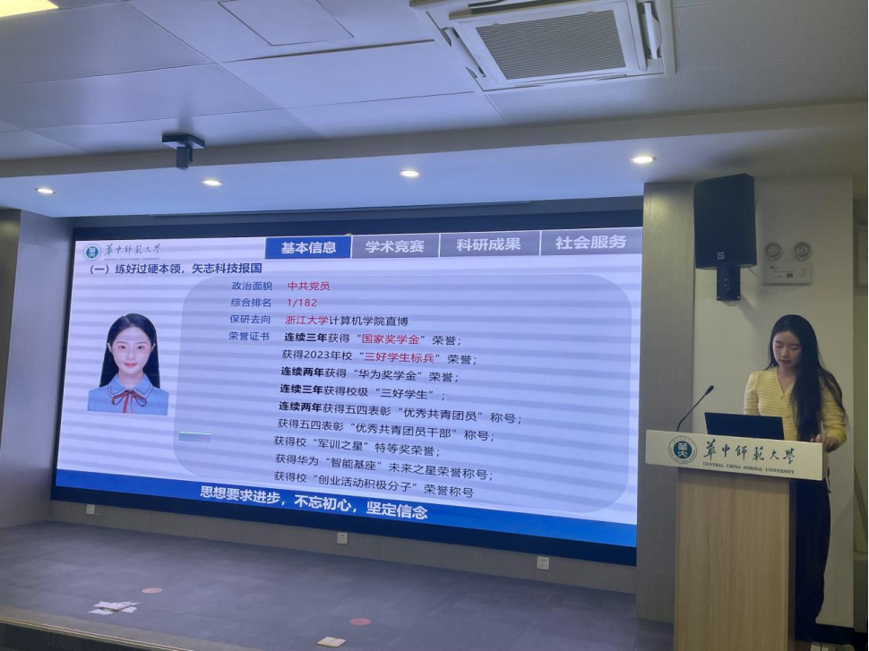 在就业赛道,参赛选手则从求职实战能力、个人发展路径、就业能力与职业目标和岗位要求的契合度等方面展开阐述。王翔宇同学详细介绍了自己对“互联网产品经理”这一岗位的认知,阐明了该岗位与国家、社会需求的契合程度。对比竞聘条件,他从自己丰富的项目管理经验和学生工作经验展示了自己求职产品经理的优势。赵潇帆同学则从基本信息、学术竞赛、科研成果、社会服务四个方面展示了自己的成长行动。从加入学院第一批华为基地班开始,到如今保送到浙江大学继续深造,她秉持“只争朝夕,不负韶华”的理念,投身于产品研发岗位的学习中。