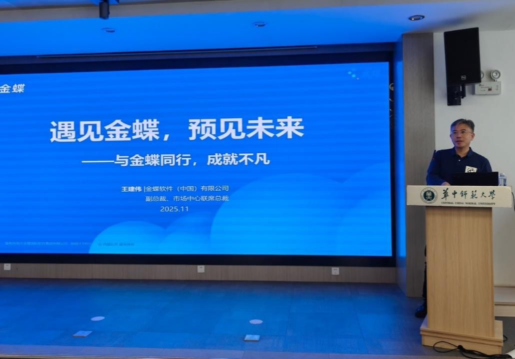 随后,王建伟以 “遇见金蝶,预见未来 —— 与金蝶同行,成就不凡” 为主题进行了分享。他结合金蝶在数字化转型领域的战略布局与发展愿景,深入剖析了当前行业发展趋势,并着重表达了金蝶软件与华中师范大学持续深化多领域合作的坚定决心,赢得现场阵阵掌声。