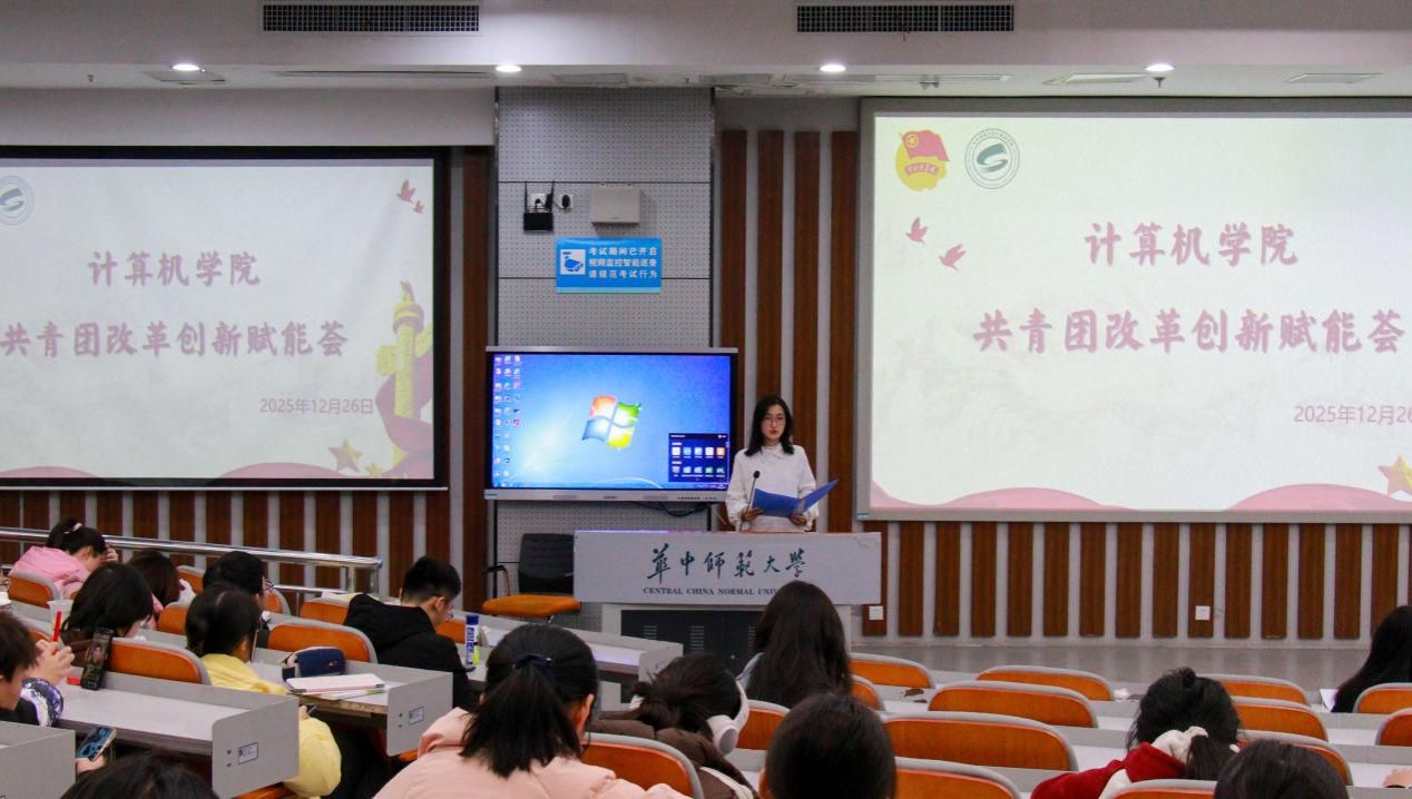 计算机学院记者团讯(通讯员 覃明凯 刘峻滔 编辑 陈宇欣 陈雯潓 李逸飞)为激发团学骨干创新活力、提升团员骨干综合素养,12月26日晚,由共青团华中师范大学委员会主办、共青团华中师范大学计算机学院委员会承办的2025年第25期共青团改革创新赋能荟于南湖综合楼N107教室举行。本期赋能荟以“团员青年助力科技创新”为主题,由学院团委书记肖克、团委副书记(学生)余思娇与李逸飞作经验分享。活动由学院团委组织部部长王翊萱主持。