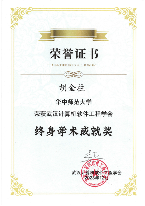 日前,我院胡金柱教授荣获武汉计算机软件工程学会终身学术成就奖。