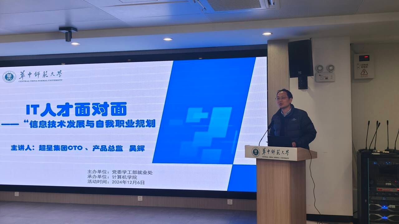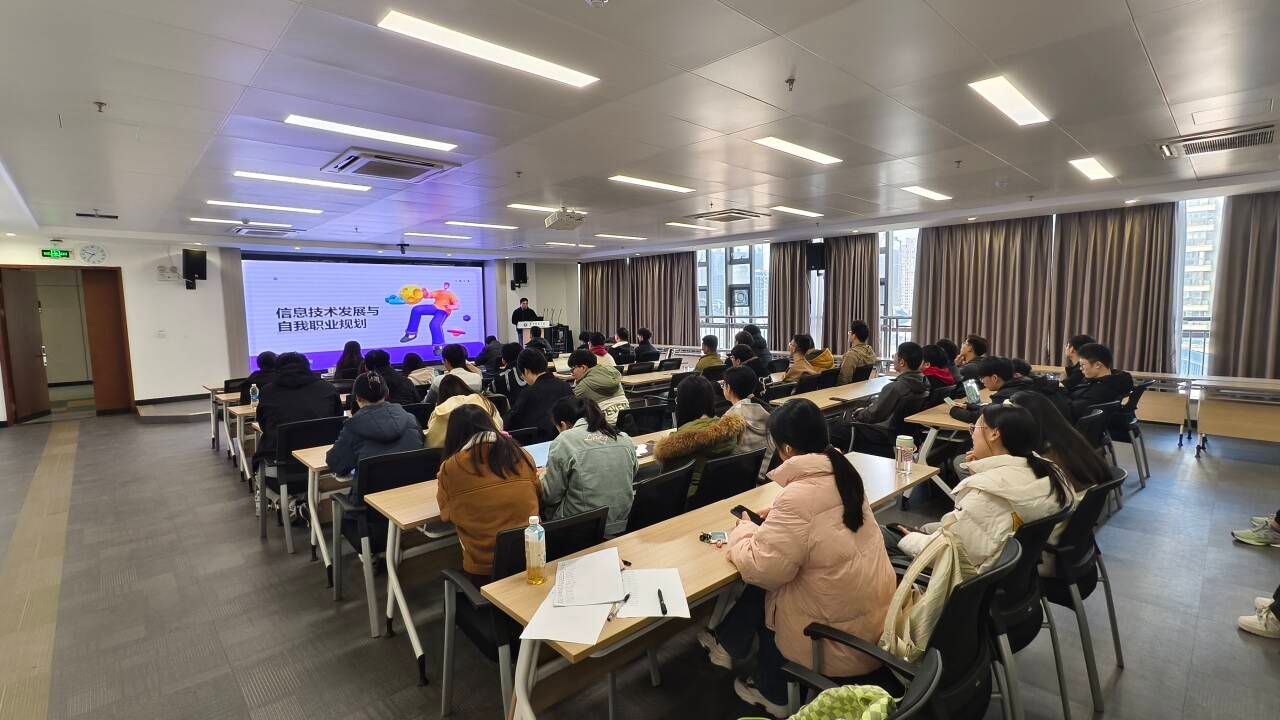 12月6日,由党委学生工作部就业处主办,计算机学院承办的“IT人才面对面”——信息技术发展与自我职业规划讲座在南湖综合楼N7119顺利举行。超星集团CTO、产品总监吴辉、职员陈最,计算机学院党委副书记庄甲鹏、辅导员孙煜林以及来自各学院的80余名学生共同参与。本次活动由庄甲鹏主持。