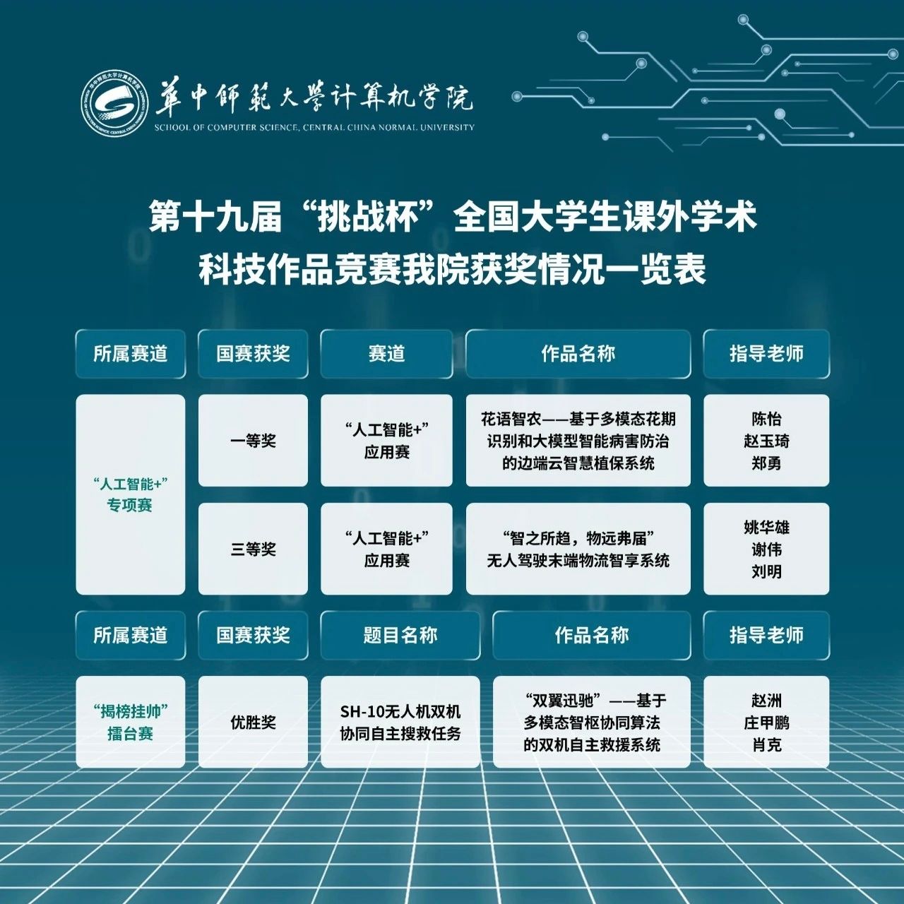 自赛事启动以来,学院高度重视、周密部署,通过专项培训、模拟答辩等多种形式,持续打磨参赛项目,为优异成绩的取得奠定了坚实基础。在“人工智能+”专项赛中,由陈怡、赵玉琦、郑勇老师指导的项目《花语智农——基于多模态花期识别与大模型智能病害防治的边端云智慧植保系统》,在应用赛道中表现卓越,荣获国家级一等奖;由姚华雄、谢伟、刘明老师指导的《“智之所趋,物远弗届”——无人驾驶末端物流智享系统》获应用赛国家级三等奖。在“揭榜挂帅”擂台赛中,赵洲、庄甲鹏、肖克老师指导的《“双翼迅驰”——基于多模态智枢协同算法的双机自主救援系统》荣获优胜奖。