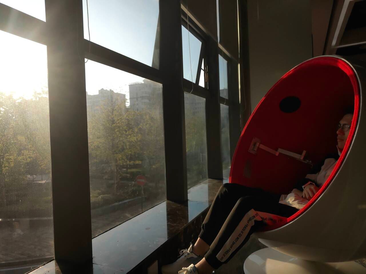 晨曦微露时静坐于靠近落地窗的视听太空舱上