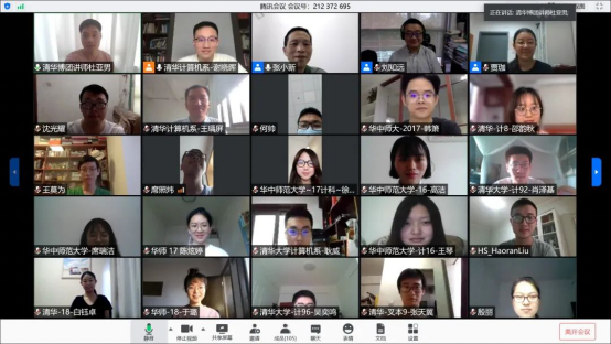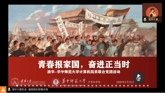 5月25日下午,清华大学计算机系与华中师范大学计算机学院以“青春报家国,奋进正当时”为主题,召开线上联合党团活动。此次联合党团活动,学习习近平总书记五四寄语和相关讲话,继承和发扬五四精神,结合疫情防控期间的典型事迹案例,展现京汉高校青年学子的使命担当和精神风貌,激励青年学子为实现中华民族伟大复兴的中国梦而努力奋斗。清华大学计算机系党委书记刘奕群,党委副书记贾珈、刘知远,研工组长易鑫,学生组长谢晓晖,党建辅导员与各年级辅导员;华中师范大学计算机学院党委书记张小新、副书记王坤,辅导员何帅、蔡庆昱、张琳、范梦宇、孙浩冉出席活动。清华大学计8第一、第二党支部,华中师范大学计算机学院本科生第一、第二党支部,本科生1801团支部等师生110余人共同参加了活动。