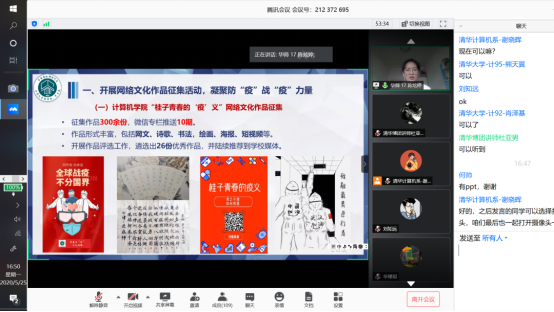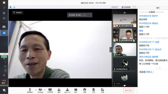 双方师生还围绕“青年力量”“科技抗疫”“学风建设”主题进行了讨论交流。清华大学黄翰同学围绕青年力量发表感受,他谈到抗疫前线青年人的身影,认为抗疫能够让青年在磨砺中成长。华中师范大学计算机学院辅导员范梦宇从自己的经历说起,讨论科技在抗疫上的应用,最后结合主题希望清华和华大学子都能继续将小我奉献给大我;2016级学生党员席瑞洁同学对科技抗疫发表了自己的看法,她讲述了在疫情中京东、高德地图等为群众生活、抗疫提供便利,作为计算机专业学子更应该投身于祖国建设活动;2017级学生党员张晨同学谈到了计算机科学技术在抗疫中的作用,并探讨计算机专业学生如何为抗疫做出更大贡献;2017级学生党员唐丛艺同学谈到了90后在此次抗疫中的重要作用,表示青年人要努力做时代的弄潮儿。