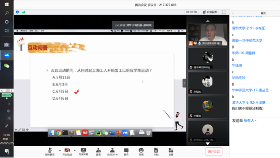 双方师生共同开展了五四主题互动问答活动,同学们积极参与,并共同学习了五四运动、五四精神、团结抗疫等相关理论和知识。