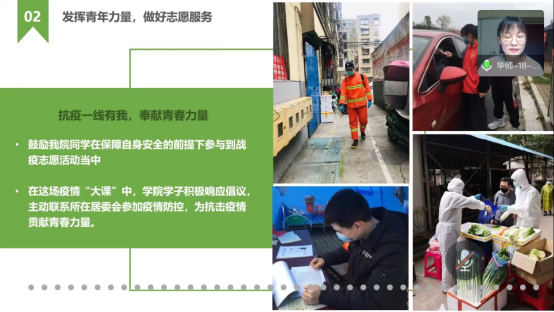 随后,来自清华大学和华中师范大学的四位学生进行了交流分享。清华大学计算机系学生会主席、清华大学研究生支教团团长耿威向大家分享了自己选择支教的原因,告诉大家自己帮助他人后的成就感和对方的感谢是自己做支教工作的动力,他认为毕业后选择前往西藏支教对自己来说是一种挑战,更是一份梦想,一种使命。清华大学特等奖学金获得者刘梦旸介绍了自己防疫期间在湖北黄冈担任志愿者的经历,他表示虽然志愿者岗位条件艰苦,有感染风险,但是青春是需要磨砺和奋斗的,他希望更好地建设家乡。华中师范大学计算机学院2017级本科生陈炫婷分享了她疫情防控期间组织开展的系列网络“青春战疫”文化活动,包括开展各类文艺作品征集、开展劳动实践活动和交流会、鼓励参与到社区活动中等,发动了同学的积极性,为抗疫做出贡献;计算机学院2018级本科生杨婷婷介绍了自己组织的活动,她积极协助团委进行线上支教、组织学生报名参加小桔灯春运志愿活动,在疫情期间成为社区志愿者并辅导了一名学生,所在团支部被评为学校“红旗团支部”和“抗疫先进团支部”。