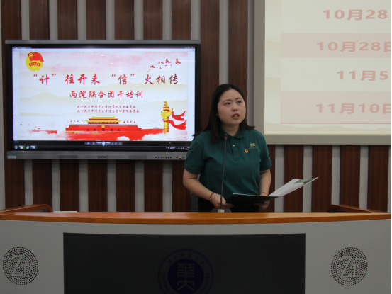 郭炜炜老师进行了思想引领教育课程授课。她以“奋进中的共青团”为主题进行系统性介绍,并从基本团情、基础团务工作以及华中师范大学共青团工作展演三个部分展开授课。郭炜炜通过阐释学校“青马工程”、实践队等育人内容,强调其对团学骨干的引领作用。