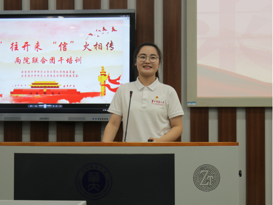 计算机学院学生团委副书记杨琪介绍了团规章制度及本期团干培训总体安排。本次培训将从礼仪、文字、素质拓展等多方面展开。同时,杨琪强调,团学干部要以严肃认真的态度对待本次团干培训,应积极参与培训班的活动。