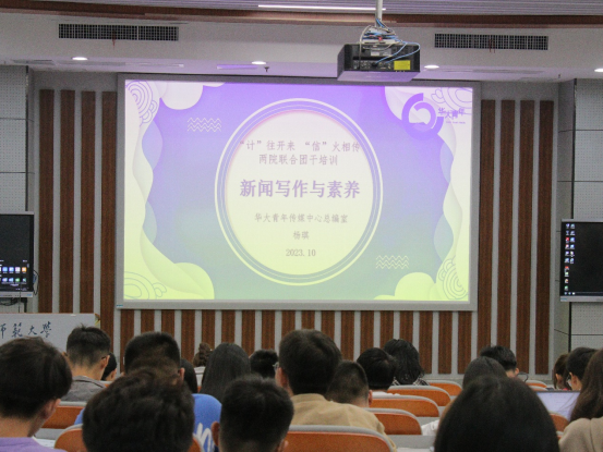计算机学院记者团讯(通讯员 林誊 梁智浩 陈齐麟 胡欣怡 编辑 景浩洋 辛琎)为继续加强新任团学干部对团委学生会工作的认识,提高学生干部的综合素质,10月22日下午,由计算机学院、信息管理学院联合举办的“‘计’往开来 ‘信’火相传”两院联合团干培训之宣传培训在南湖综合楼N107教室展开。本次培训邀请了华大青年传媒中心总编杨琪为团学干部就新闻写作与素养进行培训。
