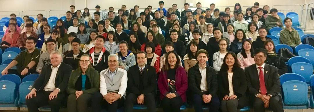 开始宣讲前,韦恩州立大学的老师们在台下亲切地和同学们相互交流,了解学生的一些基本情况。宣讲开始后,主讲人Mr.Fotouhi站上台拿起手机转过身和同学们一起拍了张自拍,同学们掌声雷动,现场气氛十分活跃。
