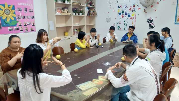 在做了一个多小时的劳动后,学员们的任务终于做完了,于是领队咨询社工是否能进行手指舞的活动。得到社工应允后,学员们一起学习了手势舞。先是志愿者庄玲带头教学了中国赞的手势舞,学员们都学的很认真,一会儿就能完整地表演一段中国赞了;然而剩下的时间还有不少,于是志愿者潘丽同又展示了她昨天学会的稻香的手势舞,大家都跟着她的每个动作,很快地学会了这简单又有趣的手势舞,并且跟着音乐来了两三遍指尖的优美舞动。劳动结束后的手势舞,使学员和志愿者们的双手得到放松,也愉悦了心情。