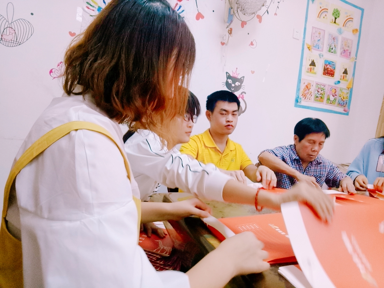 志愿者们刚到那里时,学员们还在做折纸袋子,原本计划的方案并不能立即实施,于是志愿者们纷纷入座与学员们一起做起了劳动。