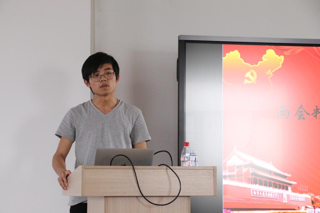 王朋飞同学作为学生党员代表,他回顾了之前我院组织的党员学习两会活动中的理论学习,强调学生党员应该在实践中加强对理论认识,坚定党的基本路线和基本原则不动摇。