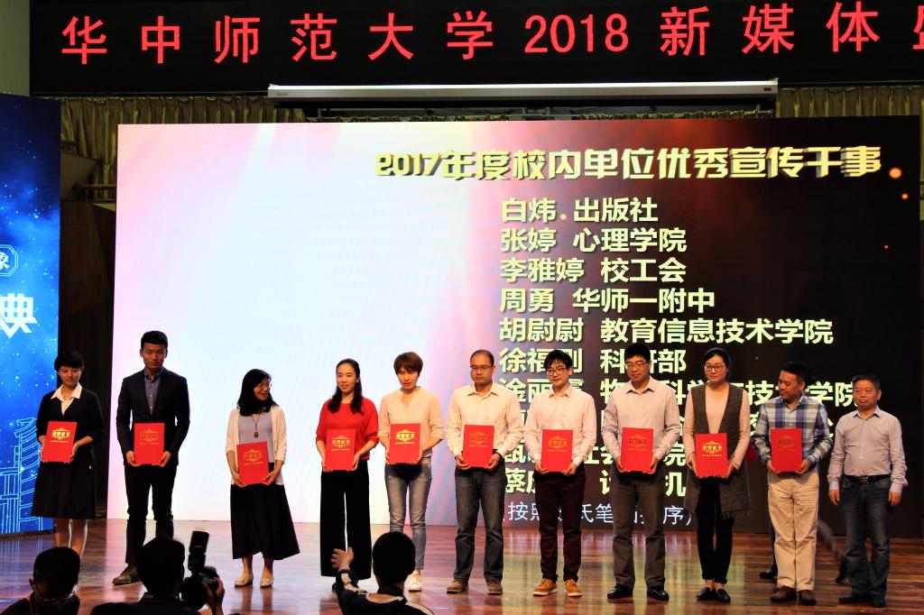 计算机学院记者团讯(通讯员 许心媚 陈泽军 编辑 要娅楠)4月20日晚,华中师范大学2018年新媒体盛典暨年度新媒体评选颁奖典礼在华中师范大学音乐厅举行。此次评选中,我院荣获“十佳官方微信”奖项。学院蔡庆昱老师获评“优秀宣传干事”。
