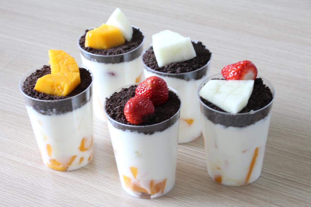 第四组参赛小组1705队的作品为“水果盆栽”,酸奶包裹着水果块,让水果多了一份神秘,猜不到下一口会咬到什么。奥利奥做成的土,让人感到好玩又饱含生机。