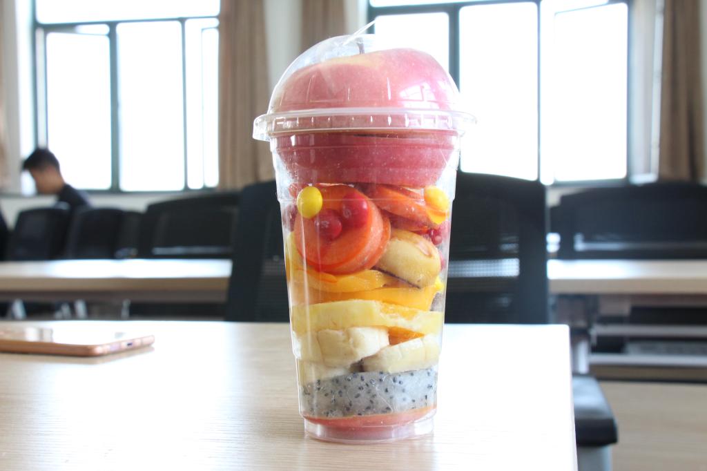 第二组参赛小组麦当劳肯德基队的作品为“等夏天等秋天”,他们的作品为渐变的水果杯,由白到红象征历经四季,最上方的苹果象征了秋天的收获,提醒同学们努力学习,为实现国家富强、民族振兴、人民幸福的伟大中国梦添砖加瓦。