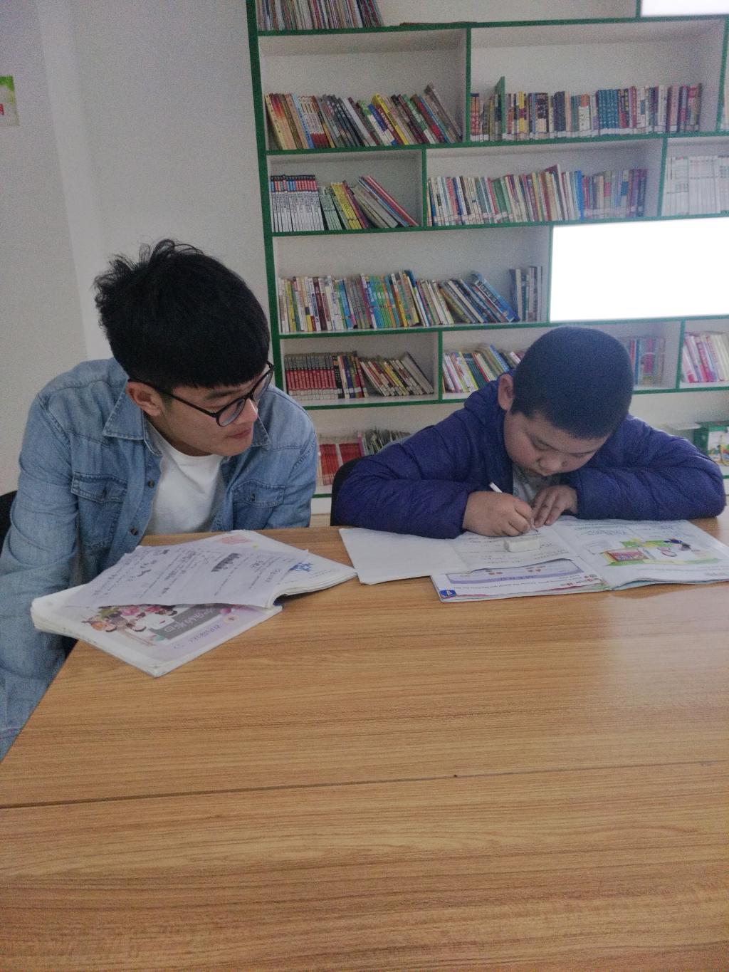 志愿者杨双阳辅导一位小朋友的作文并指出其作文还存在的缺陷。一位二年级的女孩正在做语文作业,志愿者夏乐鑫细心地为她解答她的疑惑,并检查出她作业存在的问题,告诉她错在哪儿,该怎么写对题目,下次再遇到这种题型该怎么办。 志愿者曾超勇则辅导一名男孩英语,为之解释英语句子的含义,方便其更好地理解英文对话。不久,志愿者曾超勇辅导的男孩就写完作业了,就与这名男孩还有其他写完作业的孩子们一起玩起了大富翁的游戏。
