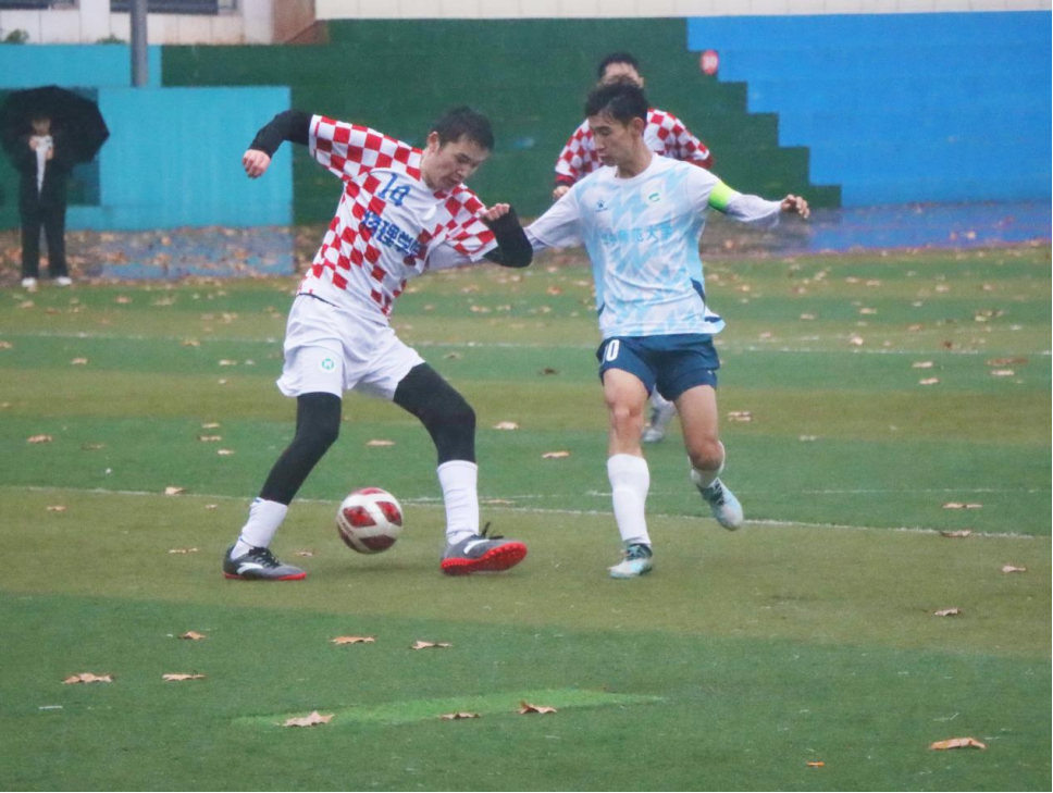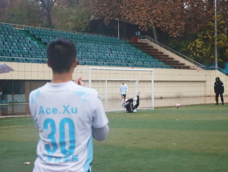 易边再战,下半场中,雨势渐大。球员们迈着矫健的步伐,荡开阵阵微波,丝毫不惧天气的影响。激烈的对抗中,物院的球员们抓住机会,再次将比分超出。在落后的情况下,计算机学院的球员们更加团结一致。计算机学院的13号球员丁威穿梭于暴雨和寒风,突破对方球员防线,终于在常规时间最后一分钟扳平比分。终场哨响起,比分最终锁定在2:2,比赛进入紧张刺激的点球大战。