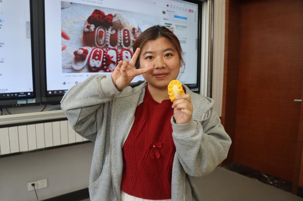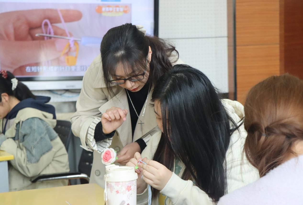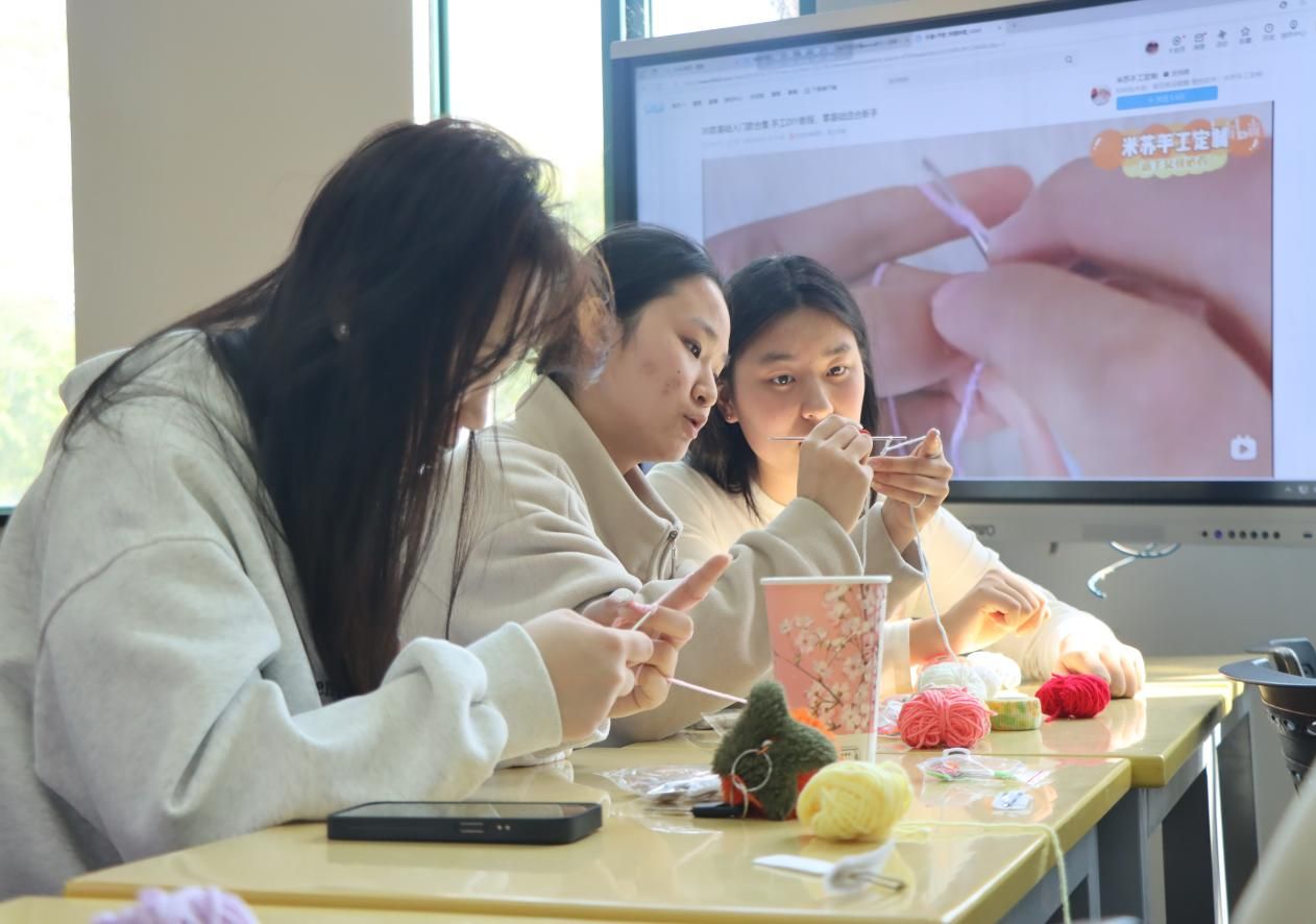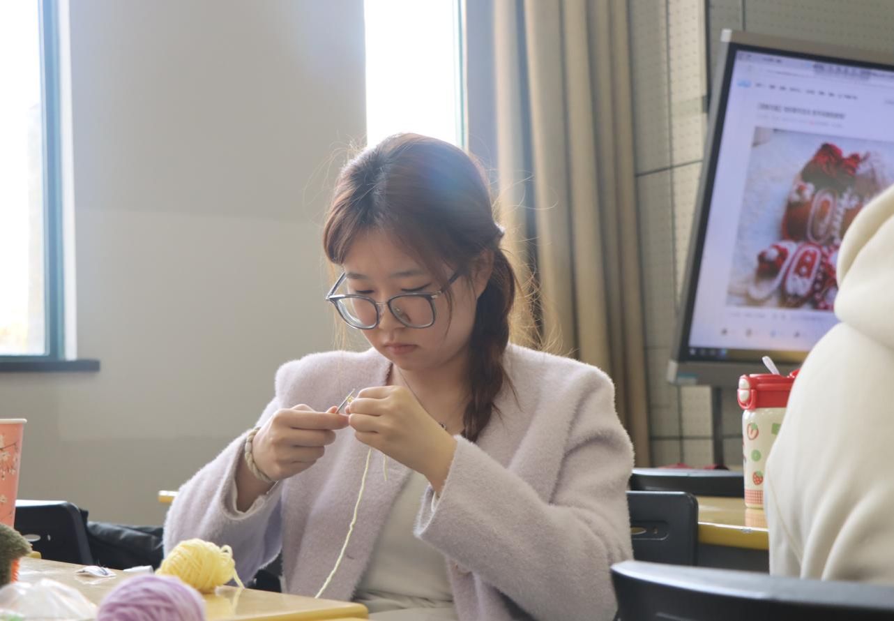 活动采用“理论教学+实践操作”模式。候可澄首先通过分解视频演示锁针、短针等基础针法,重点讲解持针手法与起针技巧。针对初学者的常见问题,候可澄进行巡回指导,主动上前示范并耐心答疑解惑。同学们相互分享钩织技巧,现场形成了良好的互助学习氛围。