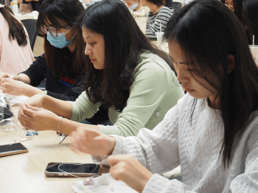 现场准备了品类多样的制作材料,包括多种颜色、材质的串珠和装饰配件,以及不同款式的编织细绳。同学们根据个人喜好挑选珠子,将不同形状与色彩的珠子精心搭配,再通过细绳串联成型。每条手链都呈现出独特的风格,大家在动手过程中充分感受到手工制作的乐趣,也放松了心情。