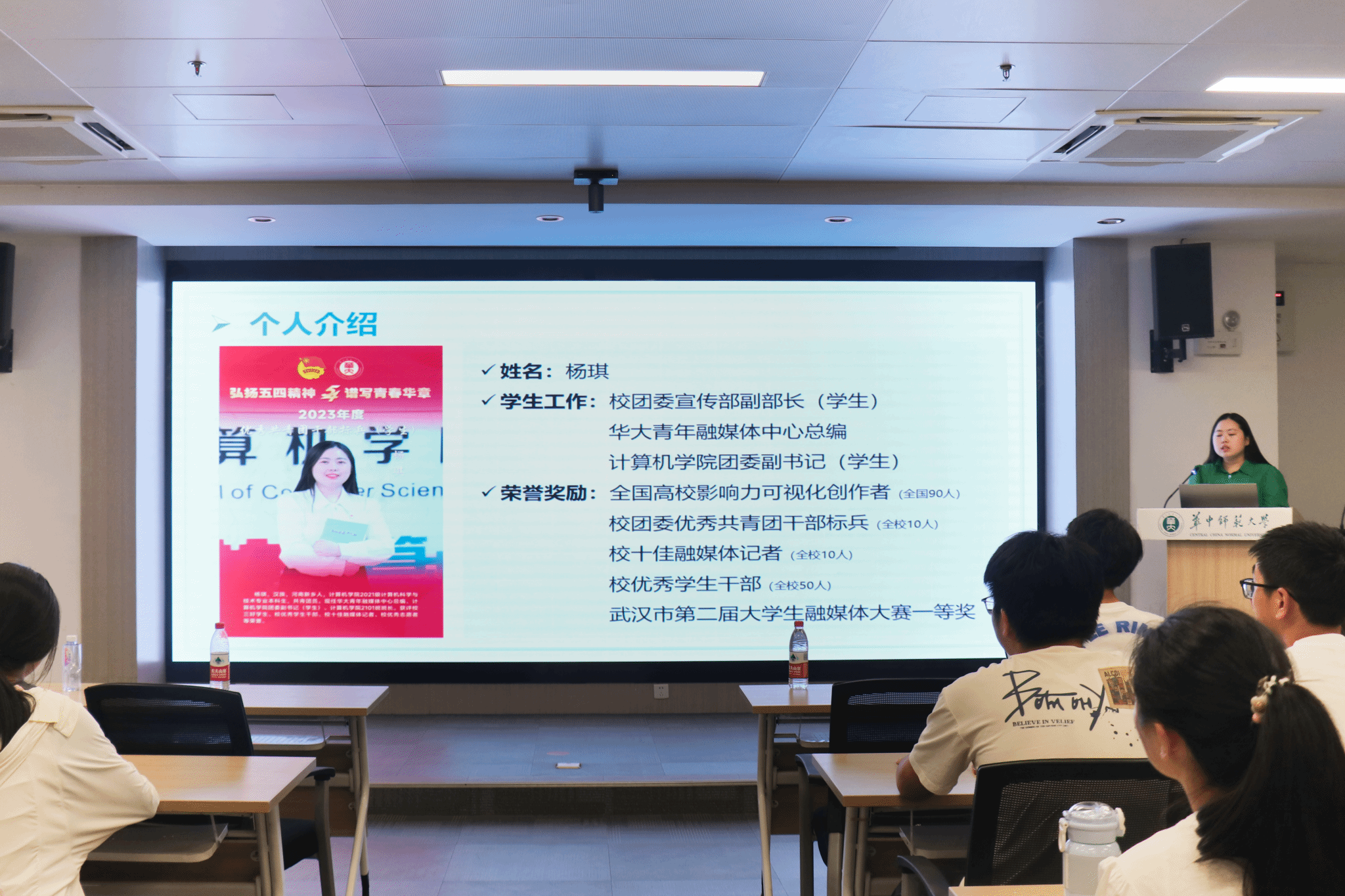计算机学院记者团讯(通讯员 罗杰 陈子妍 高涵 编辑 孙嘉晗 欧阳嘉蕙 陈雯潓)为帮助团学干部明晰工作方向、提升履职能力,6月11日下午,计算机学院“南湖菁英荟”第二期培训活动于南湖综合楼n7119会议室举行。本次培训特邀计算机学院2021级优秀毕业生杨琪担任主讲人。计算机学院学生团委副书记余思娇担任主持人,全体团学干部参加此次活动。