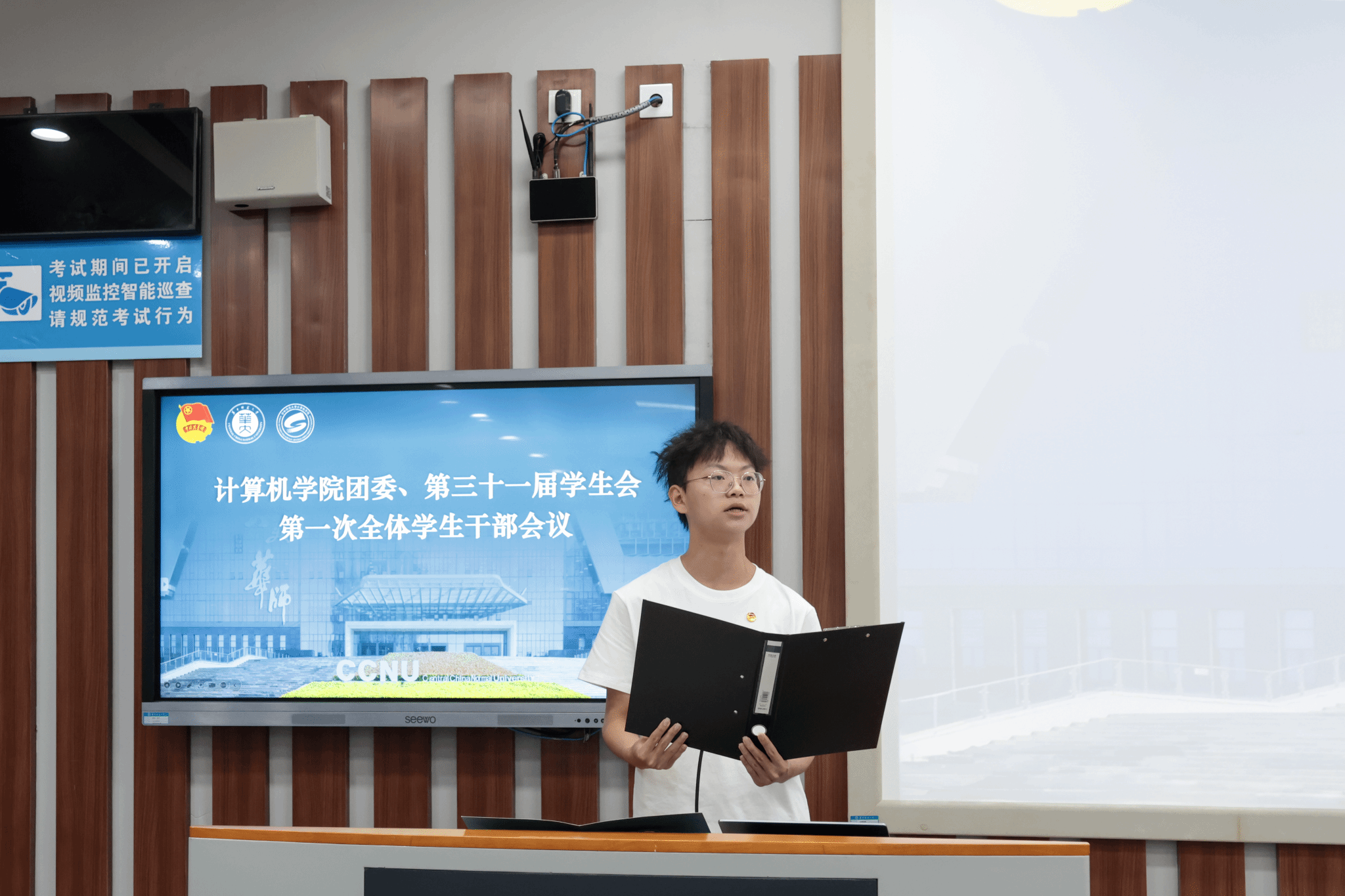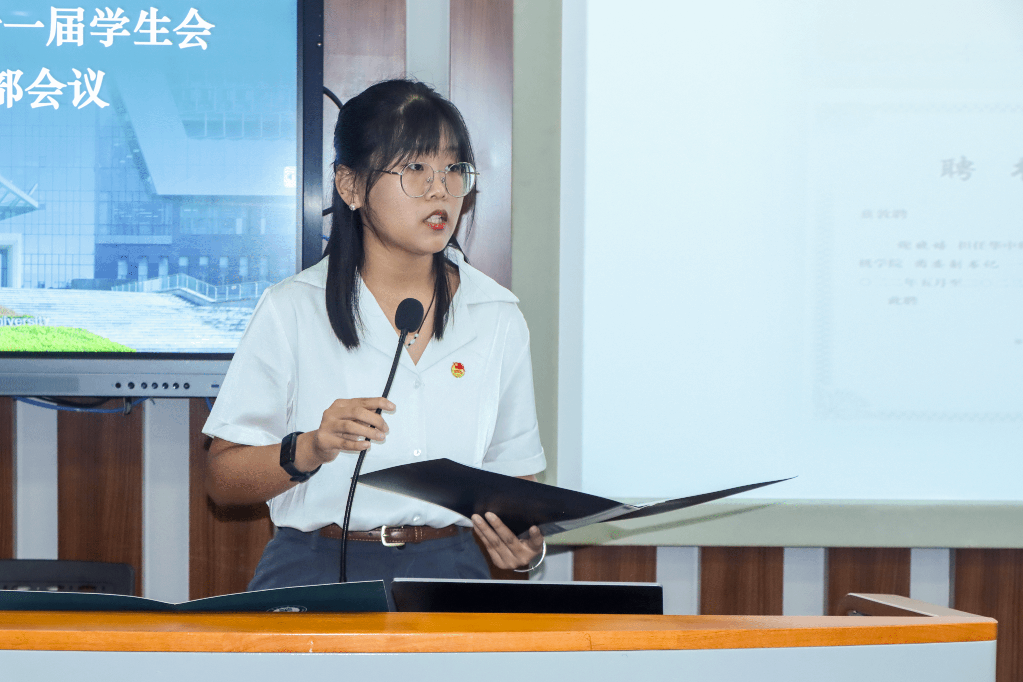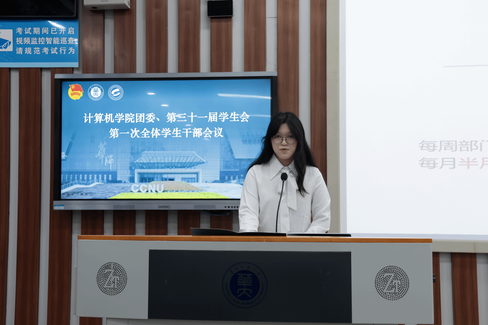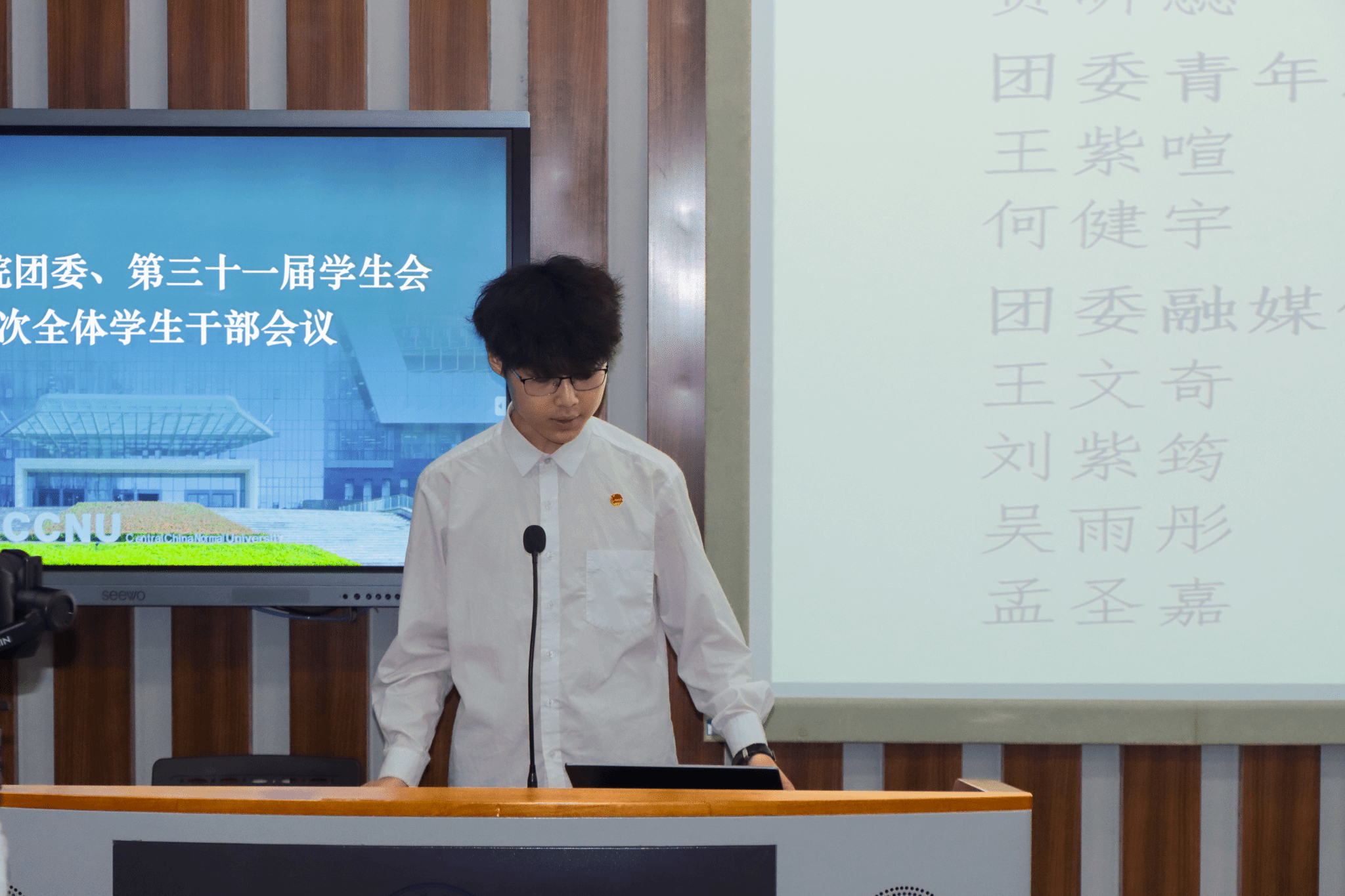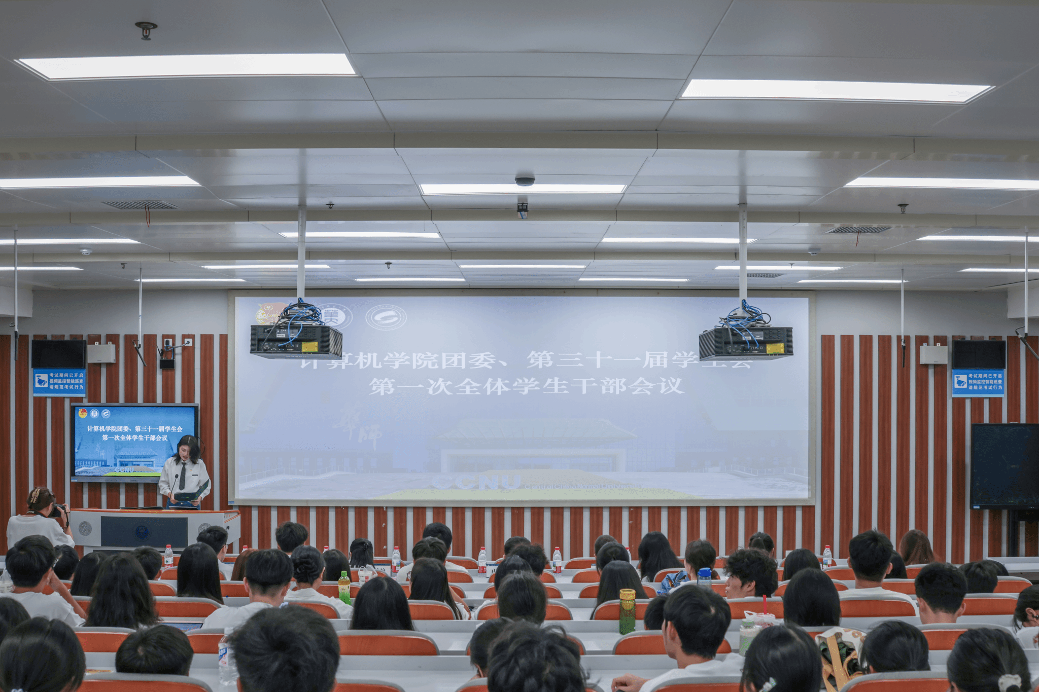 伴随庄严嘹亮的团歌声,会议正式开始。计算机学院团委副书记(学生)李逸飞、学生会主席团成员罗岳荃分别宣读团委和学生会招新名单,团委副书记(学生)余思娇、学生会主席团成员李佳乐则接续介绍本年度团委和学生会的主要工作。对职责体系与工作布局的细致介绍不仅让新成员对团学组织有了全面认知、明确了自身定位,也为后续各项工作的有序推进奠定了坚实基础。