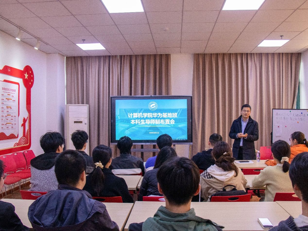 计算机学院记者团讯(通讯员 宋佩琪 田俊楠 编辑 汪语悦 欧阳嘉蕙 李逸飞)3月31日下午,华中师范大学—华为“智能基座”产教融合协同育人基地班(以下简称“基地班”)本科生导师制工作布置会于南湖综合楼7052会议室召开。计算机学院党委副书记庄甲鹏、副院长谢伟、2024级本科生辅导员赵丹、教学秘书李沛出席会议,2024级基地班全体学生参会。