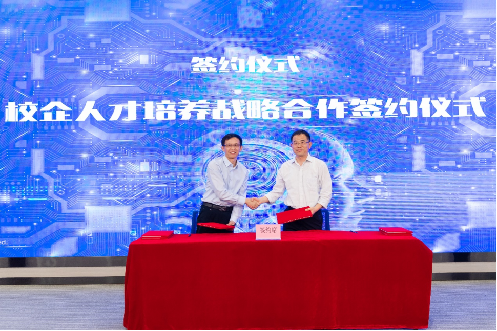 仪式现场,华中师范大学计算机学院院长蒋兴鹏与烽火通信运营管理部总经理谭国华、世纪超星集团CTO吴辉、武汉云计算科技有限公司副总经理孙进签订校企人才培养战略合作意向书。