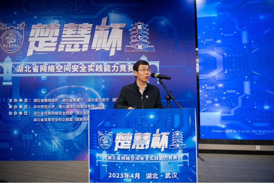 华中师范大学副校长李鸿飞在致辞中代表学校向省委网信办、省教育厅、省公安厅、省通信管理局表示感谢,向获奖团队和选手表示祝贺,向与会的领导嘉宾、专家学者和参赛选手表示欢迎。李鸿飞指出,作为承办单位,华中师范大学克服困难、积极筹备、精心组织、全力保障,使得本届竞赛务实有序、精彩高效,取得了圆满成功。学校将以本次赛事为契机,进一步加强相关学科建设,聚焦网安人才培养,致力于提升全社会网络安全意识与技能,加强与知名企业的校企合作,共同推动网络安全教育、技术、产业融合发展,形成人才培养、技术创新、产业发展的良性生态。