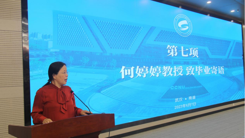 教师代表何婷婷教授为即将毕业的同学们作毕业寄语。她衷心祝贺2023届毕业生顺利完成学业,勉励他们要胸怀梦想、坚定信念,主动融入时代洪流,以奋进之姿跑出青春新篇章。她嘱咐毕业生们要注重身体健康,在学习、工作之余学会享受生活,积极参加各类活动,丰富自己的人生经验,为自己的未来打下坚实的基础。最后,她祝愿毕业生们前程似锦,前途光明,实现自己的梦想,成就辉煌的人生。