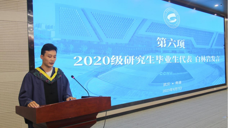 2020级研究生白林岩作为毕业研究生代表发言。他直言道:“站在毕业的十字路口,我们对这个校园充满了不舍之情。”白林岩回顾了这三年里学院领导、老师对他们的关心与照顾,重温疫情时期全学院一起克服困难和挑战的经历。这段经历见证了他们的坚韧和勇气,将成为他们人生路上宝贵的财富。他向计算机学院致以美好的祝愿,希望学院能够蓬勃发展、再创辉煌,同时,祝愿学院全体教职工身体健康、工作顺利。