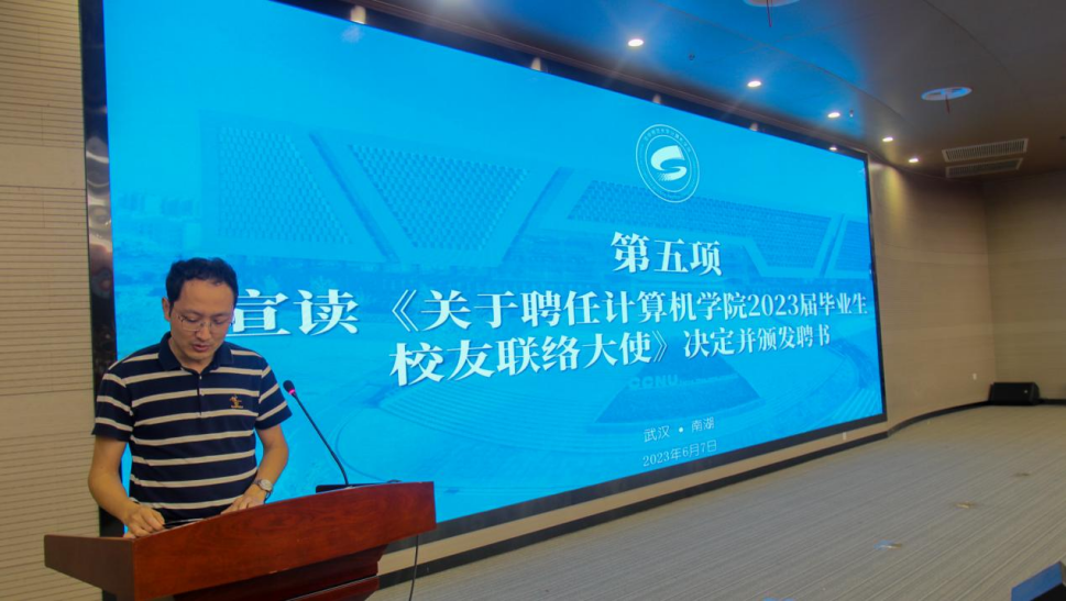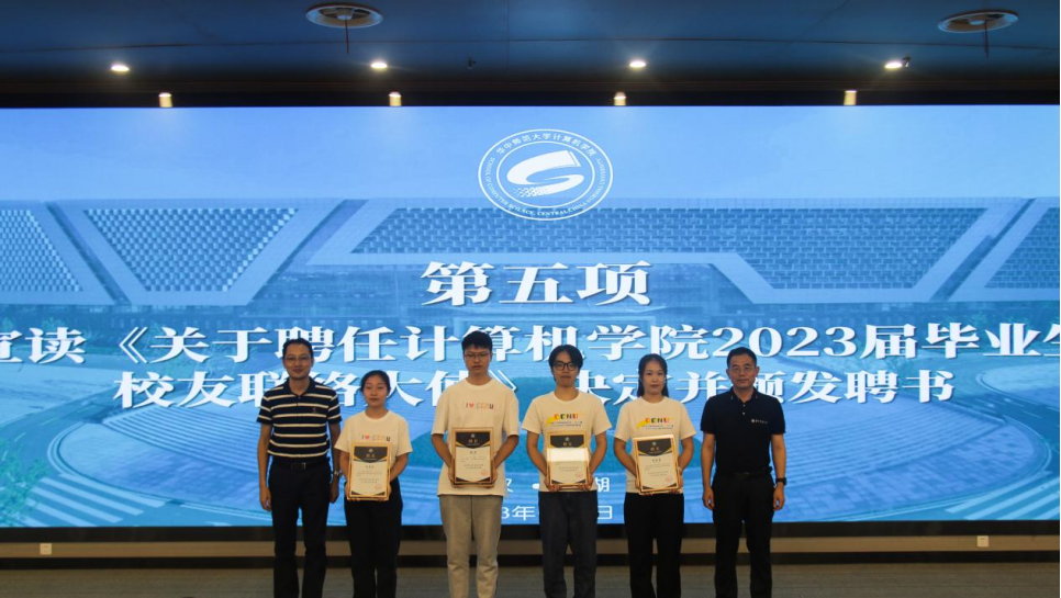 为了建立和维护毕业生与学校、学院之间的联系,增强毕业生对学校、学院的认同感和归属感,同时也为学校、学院的发展和建设提供支持和帮助,计算机学院党委副书记庄甲鹏宣读《关于聘任计算机学院2023届毕业生校友联络大使》的决定,并为颜顺等四名同学颁发聘书。