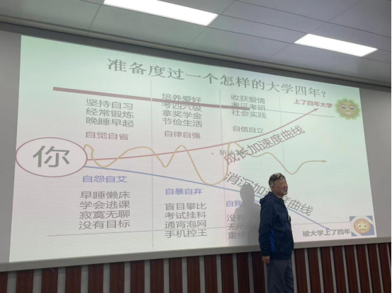 为了让同学们更好的体会大学四年不同选择与态度对人生的影响,郑教授特意制作了一幅形象的图表,并与大家分享了不同学生在做出选择后的未来走向,让同学们更加深刻地体会到自律、自省、自信、自爱的重要性。