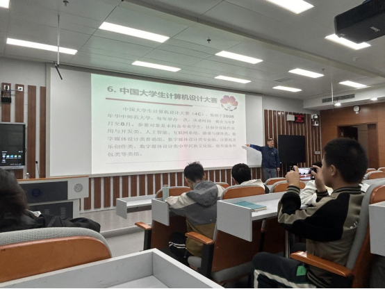 内容丰富的经验分享结束后便是同学们最为关心的竞赛介绍。郑教授主张“以赛促思,以赛促学,以赛促教,以赛促创”,他认为参加竞赛可以锻炼同学们自主设计、自主研究、自主创造的才能。郑教授也为大家详细介绍了各项竞赛的赛程与侧重点,并展示了往年我院取得的优异成绩。郑教授鼓励同学们通过竞赛提高自己的创新思维,将计算机能力与其他方向的技术进行有机结合,在竞赛过程中培养刻苦精神,提升团队协作力,唯有全方位发展,才能成为可堪大用的人才。