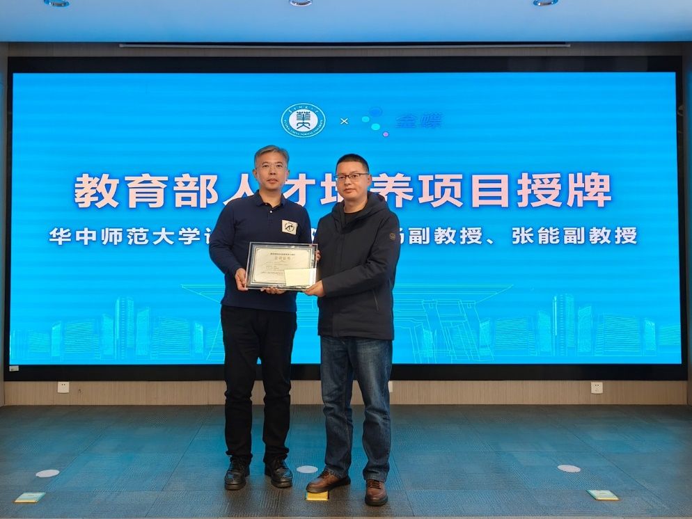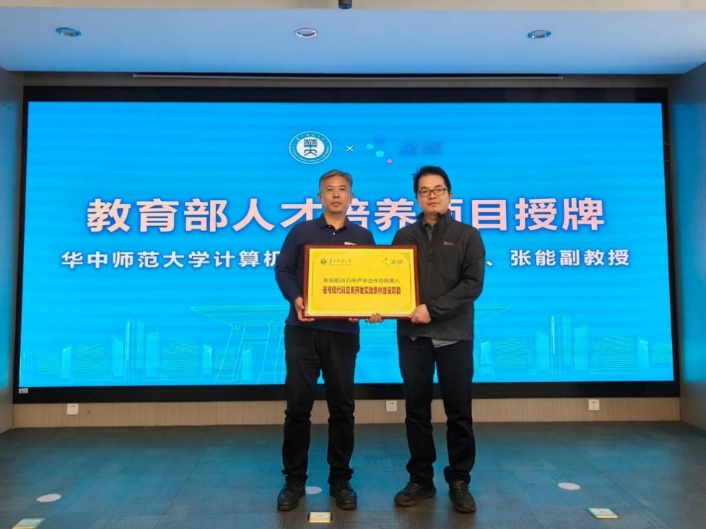 自双方签约合作以来,依托共建的国家企业互联网服务支撑软件工程技术研究中心武汉分中心,凭借各自在人工智能与软件领域的优势,华中师范大学计算机学院在数智化领军人才和新工科拔尖创新人才培育方面积极探索,已取得一系列初步成效。其中,由李增扬副教授主持的 “华中师范大学苍穹定向人才培养项目” 成功获批第四期教育部供需对接就业育人项目,张能副教授主持的 “苍穹低代码应用开发实践条件建设项目” 获批教育部产学合作协同育人项目。活动现场,王建伟为这两个获批项目分别授牌,标志着项目正式进入实质性推进阶段。